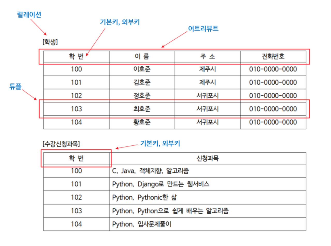 - 속성(Attribute) : HTML로 따지자면 Table Heading (ex.학번, 이름, 주소, 전화번호)