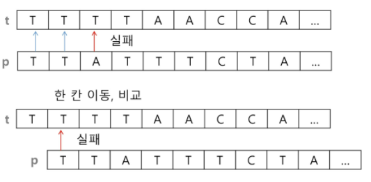 - 패턴을 전처리하여 배열 next [M]을 구해서 잘못된 시작을 최소화함