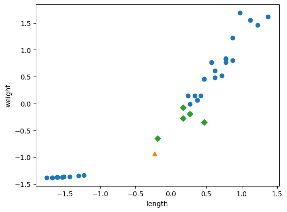 그림이 뭔가 이상해보인다. 분명 도미가 더 가까워보이는데 빙어가 체크되었다. 그 이유는 x축과 y축의 스케일이 다르다. 스케일이 다를 경우 데이터 전처리를 해줘야 한다. 표준점수를 사용해보자