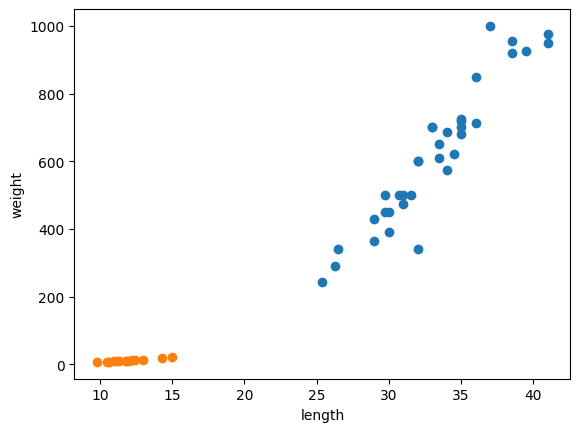 파란색 -> 도미데이터 선형적, 길이가 길수록 무게가 많이 나감