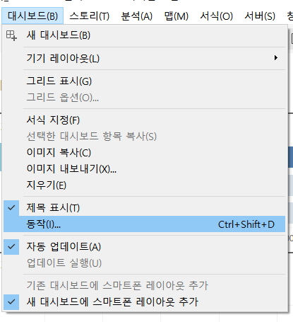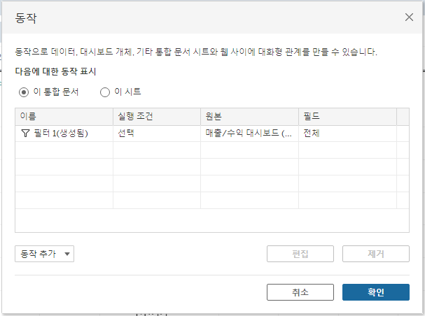 대시보드->동작에서 필터 볼수 있음 / 새로운 동작 추가도 가능