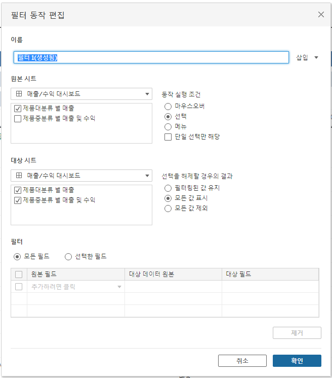 대시보드에서 필터로 사용을 누르기