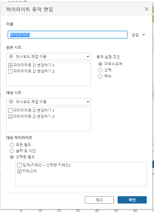 목표 : 2-1과 2-2를 이용해서 대시보드를 만들고 대시보드 동작을 이용해 해당 카테고리 별 제품을 하이라이트 해보기