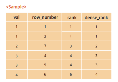 , DENSE_RANK() OVER (ORDER BY val) AS dense_rank