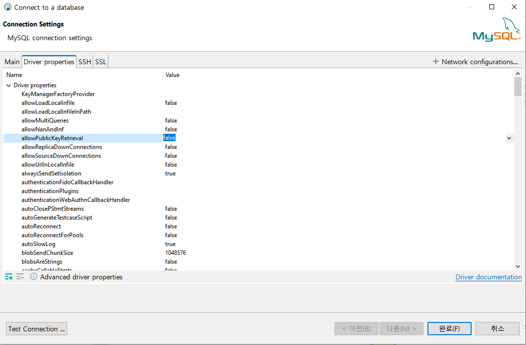 Driver properties 탭을 클릭 후 Driver properties에 값 변경