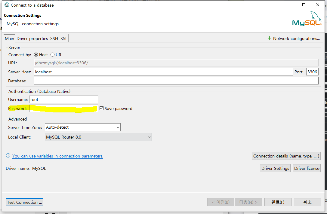 password 부분에 MySQL에 설정된 비밀번호를 입력해야함