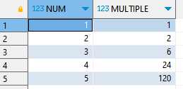 , @MUL := @MUL * NUM as MULTIPLE
