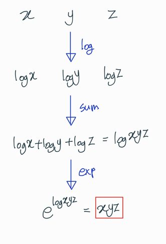 LOG -> SUM -> EXP 순으로 연산하면 곱셈을 구할 수 있다.