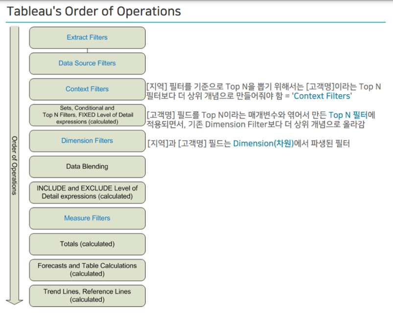 - 데이터 연결 및 정제 과정에서 이상잉 없고 태블로 영역에서 느리다면 필터 영역을 확인해야 한다.