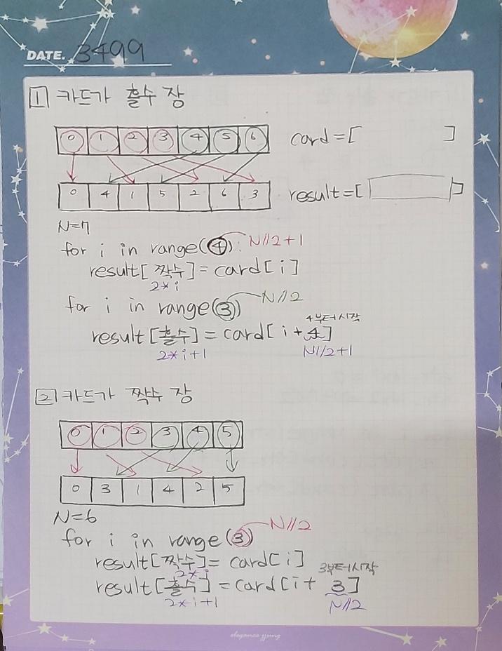 N개의 카드가 있는 덱이 주어질 때 이를 퍼펙트 셔플하면 어떤 순서가 되는지 출력하는 프로그램을 작성하라.